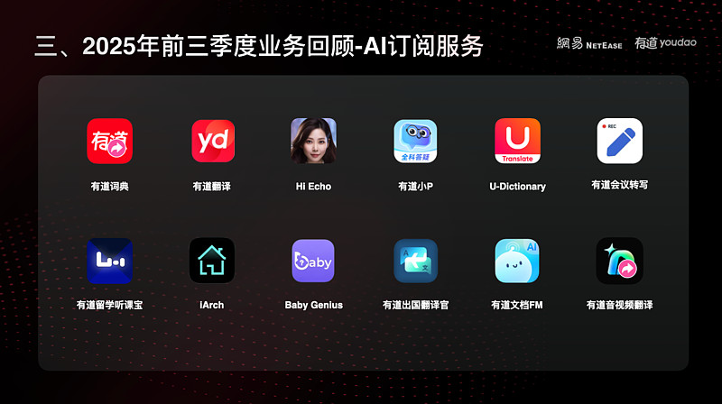 有道文档FM。我们看到用户在处理长文档和音视频时效率很低,于是把翻译、摘要、朗读和要点整理做成了一个一体化的AI文档助手。用户上传文档后,可以一次性完成理解和整理,大幅提升学习和研究效率,产品上线后,也获得了苹果App Store的官方推荐。有道音视频翻译,可以为多语种的视频、音频和会议录像等自动生成高质量字幕,通过AI听写与翻译模型的深度协同,我们在保证高准确率的同时,将处理成本降低至行业平均水平的十分之一,从而为用户提供更高性价比的服务。目前已经广泛应用在网课、跨国会议和影视内容等场景中。2024年一季度,我们首次单独披露AI订阅服务的销售额,当季约5000万元;经过短短六个季度,到今年第三季度,这一数字已经增长到约1亿元,创下历史新高,同比增长超过40%。我们认为,AI订阅服务目前仍处于业务发展的早期阶段,随着产品能力和应用场景的持续拓展,这块业务还有很大的上升空间。