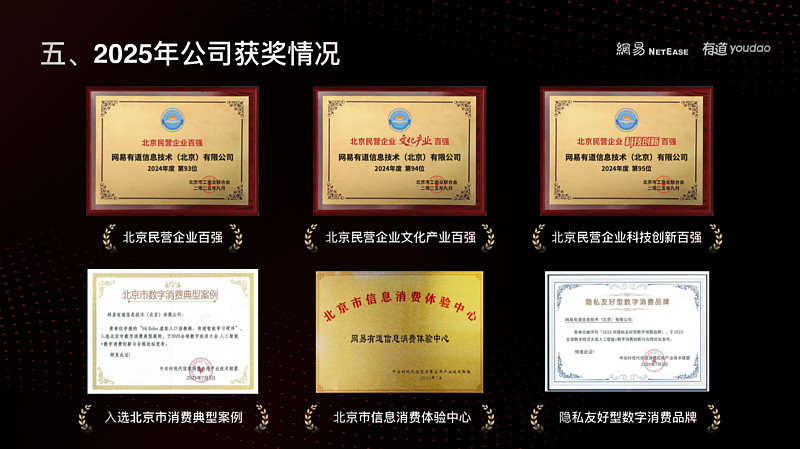 此外,有道已连续五年入选 “北京民营企业百强”“北京科技创新百强”,今年也首次进入“北京民营企业文化产业百强”,既反映了公司在技术创新上的持续投入,也体现了我们在民营经济和文化科技融合方向上的稳健发展能力。
