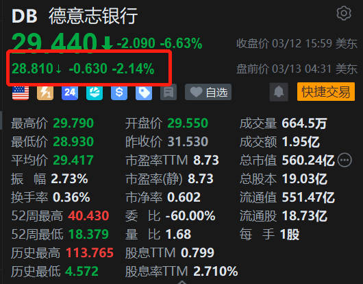 格隆汇3月13日|昨日大跌6.6%的德意志银行(DB.US)美股盘前继续下跌超2%。消息上,德意志银行披露其在私募信贷领域的风险敞口达260亿欧元(300亿美元)。该资产类别正面临资金赎回、承销标准审视以及人工智能对软件生产商等部分借款人影响的三重挑战。该行在周四发布的年度报告中表示,虽未暴露于非银行金融机构相关的“重大风险”,但可能通过关联投资组合及交易对手面临潜在间接信用风险。