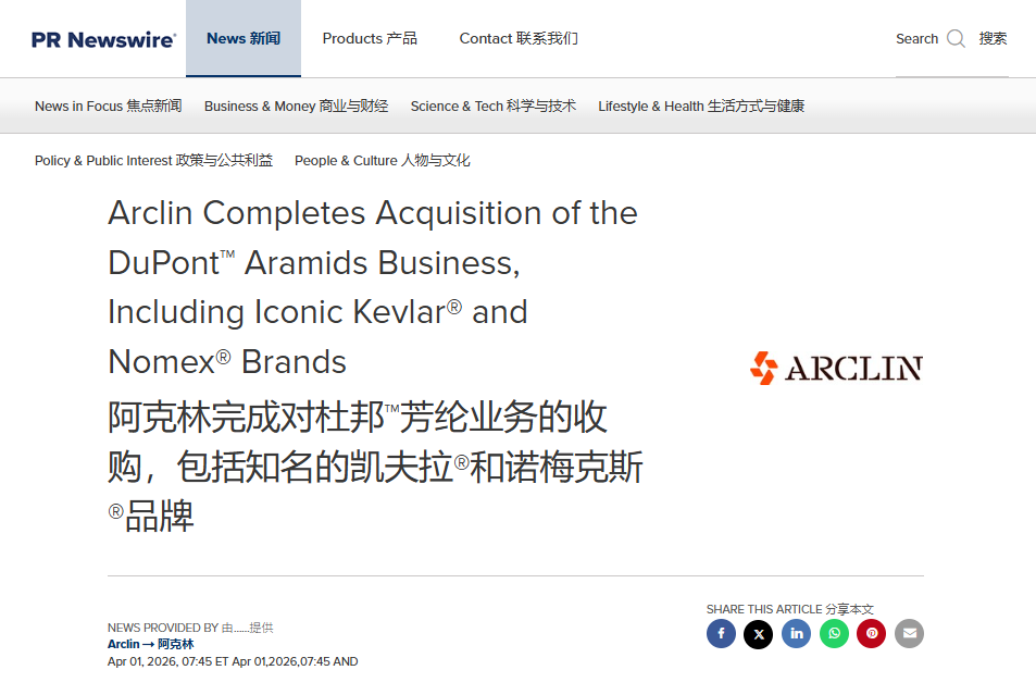 4月1日,全球材料科技巨头杜邦对外官宣,旗下芳纶业务板块已完成全部剥离交割手续,该业务正式由私募机构TJC, L.P.(简称TJC)旗下投资组合公司Arclin接手,标志着杜邦业务结构调整再落关键一子。