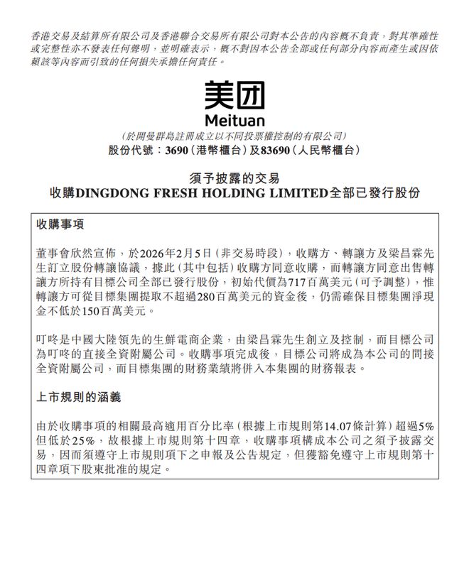 美团宣布将用 7.17 亿美元,全资收购叮咚买菜的国内业务。