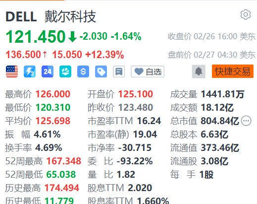 格隆汇2月27日|戴尔科技(DELL.US)盘前大涨超12%,报136.5美元。消息面上,公司公布业绩显示,第四季度营收创下334亿美元的新纪录,同比增长39%,高于分析师预期的317亿美元。第四季度摊薄每股收益创下3.37美元的新高,同比增长57%;非GAAP摊薄每股收益创下3.89美元,同比增长45%,高于分析师预期的3.52美元。