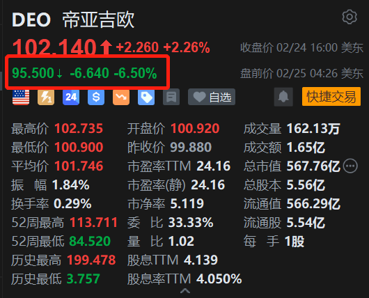 英国烈酒制造巨头帝亚吉欧(DEO.US)盘前跌6.5%报95.5美元。消息上,帝亚吉欧周三表示,其上半年财季利润同比增长,但销售额较去年同期下滑。对于2026财年,公司预计有机净销售额将下降2%至3%,而有机营业利润增长率将在持平至低个位数增长之间。(格隆汇)