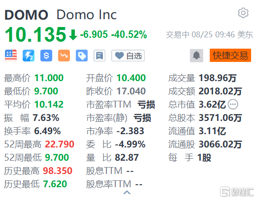 商业情报(BI)软件公司Domo Inc (DOMO.US)股价暴跌超40%,报10.135美元。消息面上,公司预计全年营收将介于3.16亿美元至3.20亿美元之间,低于之前预测的3.23亿美元至3.30亿美元,也低于市场预期的3.26亿美元。调整后全年每股亏损预计介于39美分至47美分之间,较此前预期的27美分至39美分有所扩大,也超过了市场预期的每股亏损35美分。