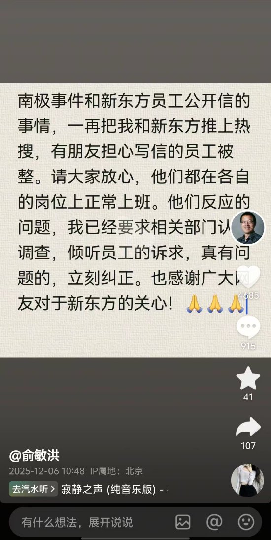俞敏洪表示,“南极事件和新东方员工公开信的事情,一再把我和新东方推上热搜,有朋友担心写信的员工被整。请大家放心,他们都在各自的岗位上正常上班。”