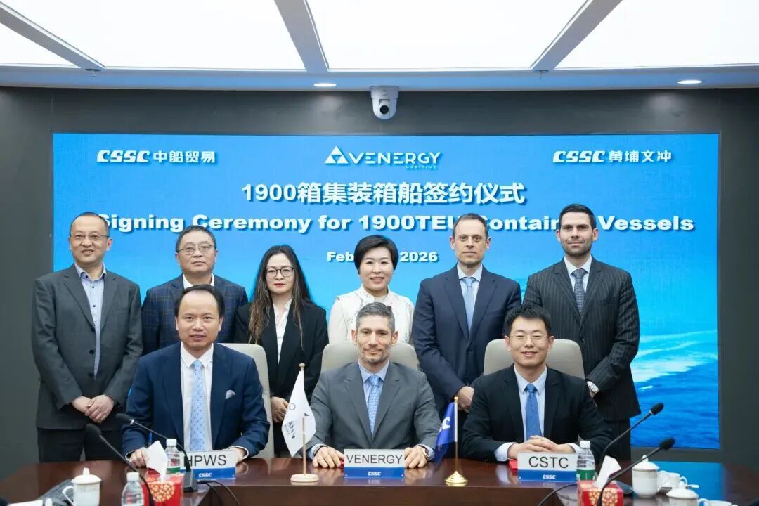 据中船黄埔文冲消息,2月6日,中国船舶集团旗下中船黄埔文冲船舶有限公司联合中国船舶工业贸易有限公司,与希腊航运公司 Venergy Maritime Limited 在上海举行签约仪式。此次签约意味着Venergy在华首份新造船订单——共计4艘“鸿鹄”型1900TEU支线集装箱船全部落地,中希双方在高端船舶制造领域的合作进一步加深。