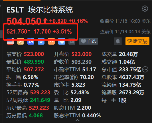 格隆汇11月19日|埃尔比特系统(ESLT.US)盘前涨3.5%报521.75美元。消息上,埃尔比特系统公司获得以色列国防部2.1亿美元合同,用于升级梅卡瓦主战坦克。另外,摩根大通将公司目标价格从520美元上调至530美元。