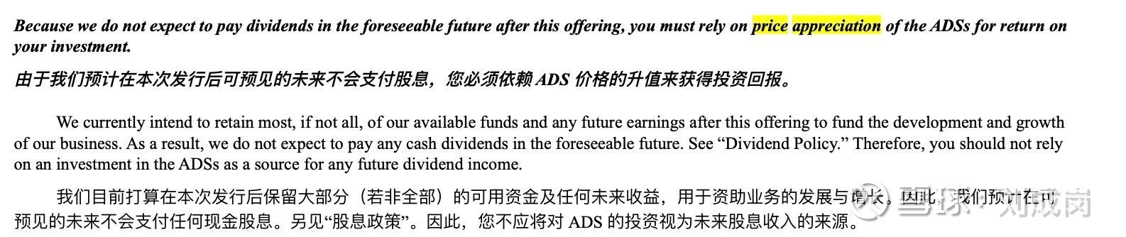 支持。但最后一点,招股书里还真的写了不分红。之后每一年的年报里也都写了。招股书第65页,Dividend Policy: