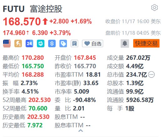 格隆汇11月18日|昨日收涨1.69%的富途控股(FUTU.US)今日美股盘前续涨3.79%报174.96美元。消息面上,富途控股公布截至2025年9月30日止第三季度未经审计财报。期内,公司总营收为64.03亿港元(约8.23亿美元),同比增长86.3%;在非美国通用会计准则下(Non-GAAP),净利润为33.12亿港元(约4.26亿美元),同比增长136.9%。按业务分类,第三季度交易佣金及手续费收入为29.14亿港元(约3.74亿美元),同比增长90.6%;利息收入为30.45亿港元(约3.91亿美元),同比升79.2%;其他收入(包括财富管理、企业服务业务等)为4.44亿港元(约5,707万美元),同比增长113.0%。(格隆汇)