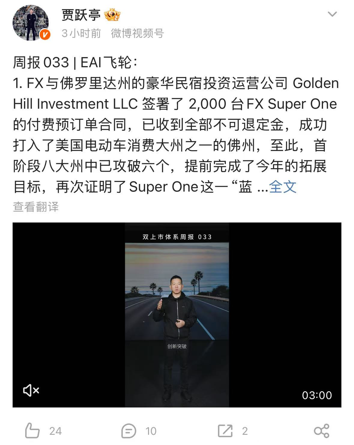 12月15日,Faraday Future(FF)创始人、联席CEO贾跃亭在微博发文称,FX与佛罗里达州的豪华民宿投资运营公司 Golden Hill Investment LLC 签署了 2,000 台FX Super One 的付费预订单合同,已收到全部不可退定金,成功打入了美国电动车消费大州之一的佛州,至此,首阶段八大州中已攻破六个,提前完成了今年的拓展目标。