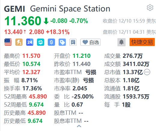 Gemini Space Station(GEMI.US)盘前大涨18.31%,报13.44美元。消息面上,公司衍生品交易部门Titan获得了美国商品期货交易委员会(CFTC)颁发的指定合约市场(DCM)许可证,可以开始向美国客户提供预测市场服务。(格隆汇)