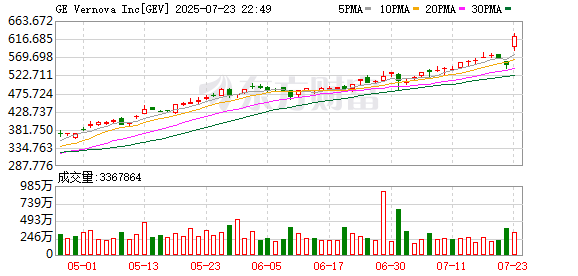 电力巨头GE Vernova盘中拉升涨超13%,股价最高触及629.97美元,创历史新高,公司Q2营收、净利润、每股收益均超市场预期。