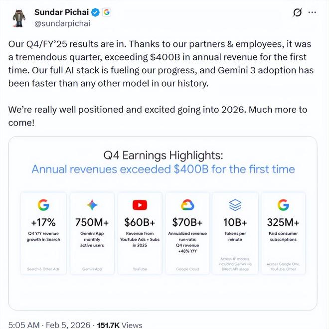 财报发布后,CEO 桑达尔·皮查伊(Sundar Pichai)随即在 X 平台上分享了这一成绩,并特别强调:“AI 技术栈推动了我们的进步,Gemini 的采用速度比历史上任何其他模型都要快。”