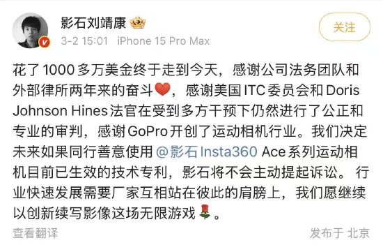 新浪科技讯 3月2日下午消息,影石创始人刘靖康发文,对337调查终裁胜诉进行回应。