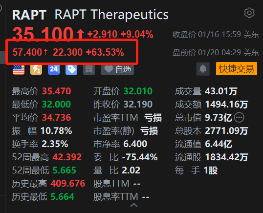 RAPT Therapeutics盘前飙涨63.5%,报54.4美元。消息上,葛兰素史克将以每股58美元收购RAPT Therapeutics,股权价值为22亿美元。预计前期投入资金为19亿美元。在上周五停牌前RAPT Therapeutics市值10亿美元不到。