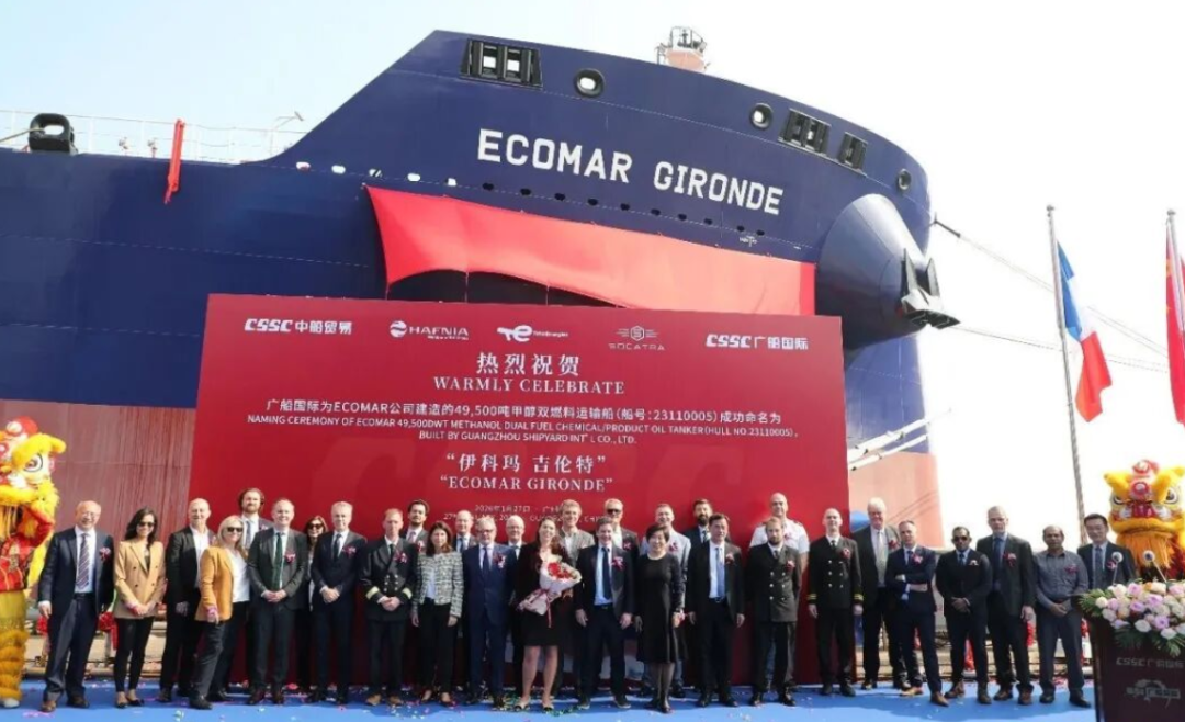 1月27日,中船广船国际联合中船贸易为新加坡HAFNIA和法国SOCATRA创立的合资公司ECOMAR建造的4.95万吨甲醇双燃料化学品船4号船举行命名交付仪式,新船被命名为“ECOMAR GIRONDE(伊科玛 吉伦特)”号。随着该船交付,标志着该项目4艘船建造圆满收官。