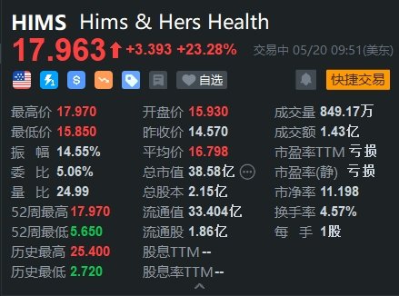 平价医疗保健公司Hims & Hers Health Inc.首发减肥药,每针较诺和诺德Wegovy低85%,较礼来制药也提供大约一五折。Hims美股盘初涨幅扩大至23%,礼来涨超1.1%,罗氏ADR涨约0.6%,诺和诺德ADR涨0.3%。