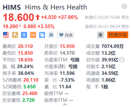 格隆汇5月21日|昨日收涨27.66%的Hims & Hers Health(HIMS.US)今日美股盘前续涨3.55%,报19.26美元。公司在周一宣布,将推出司美格鲁肽复合药物,起售价为每月199美元。而使用同样成分的诺和诺德Wegovy售价则至少为每月1350美元,诺和泰也要900多美元,也就是说至少能便宜8成。未来还将推出79美元/月的口服减肥复合药物。