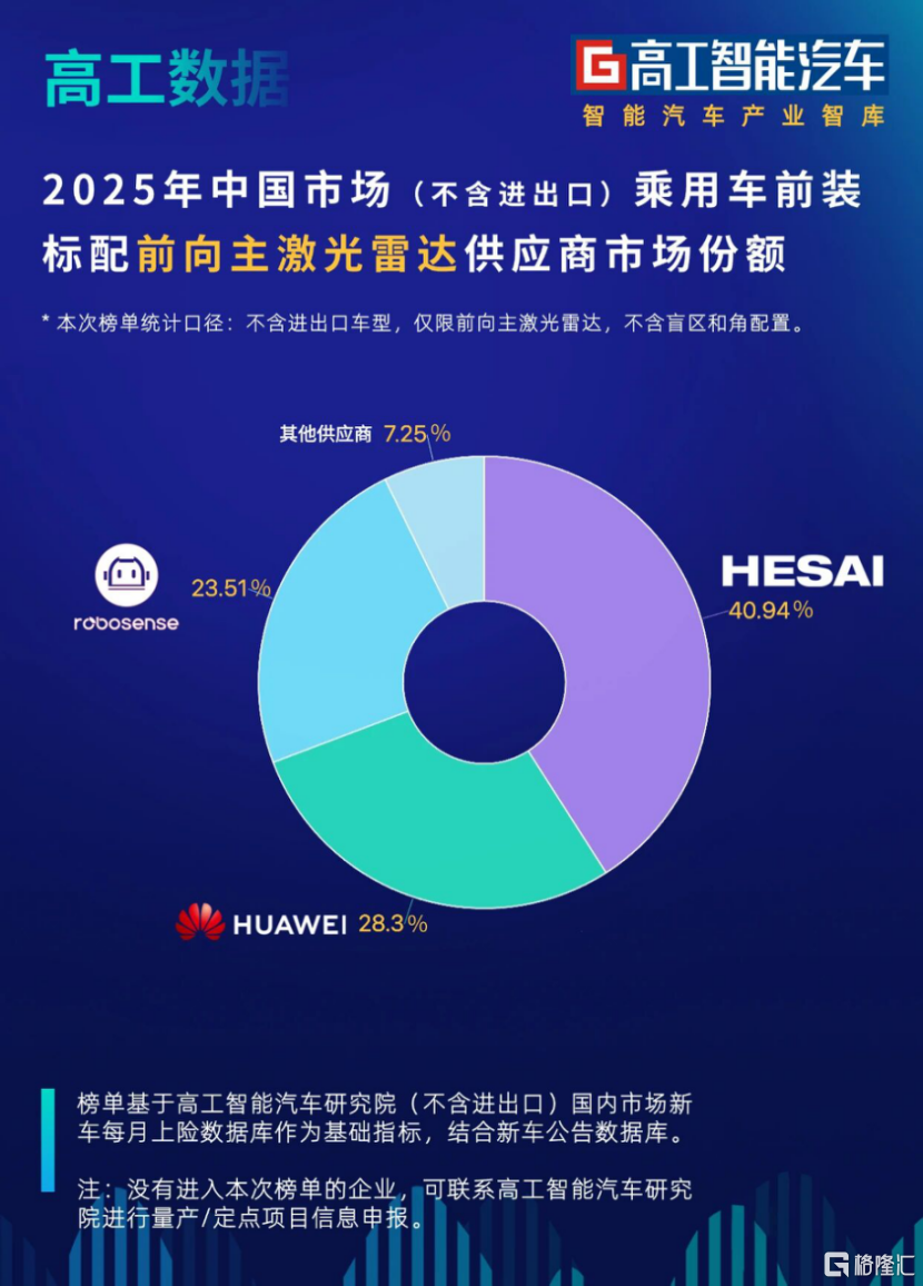 而禾赛是这一浪潮的最大赢家,并形成断层式领先。高工数据显示,2025年禾赛在中国市场乘用车前装标配前向主激光雷达领域,以超40%的市场份额稳居行业第一。根据盖世数据,2025年中国乘用车市场主激光雷达总装机量为275.6万台,禾赛贡献114.3万台,是行业第二名的近1.5倍、第三名的近2倍。