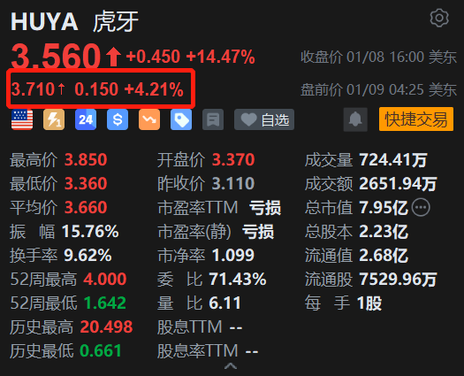 格隆汇1月9日|昨日大涨14.47%的虎牙(HUYA.US)盘前继续上涨4.2%。消息上,周四,由虎牙与金山世游联合发行的《鹅鸭杀》手游正式公测开服。《鹅鸭杀》手游公测上线仅24小时,新增注册用户数量即突破500万,并登顶iOS免费榜,随后占据多家商店平台游戏榜榜首。虎牙相关负责人表示,《鹅鸭杀》手游目前的渠道表现、社媒热度、市场反响,反映了端游积累的IP人气与口碑沉淀。