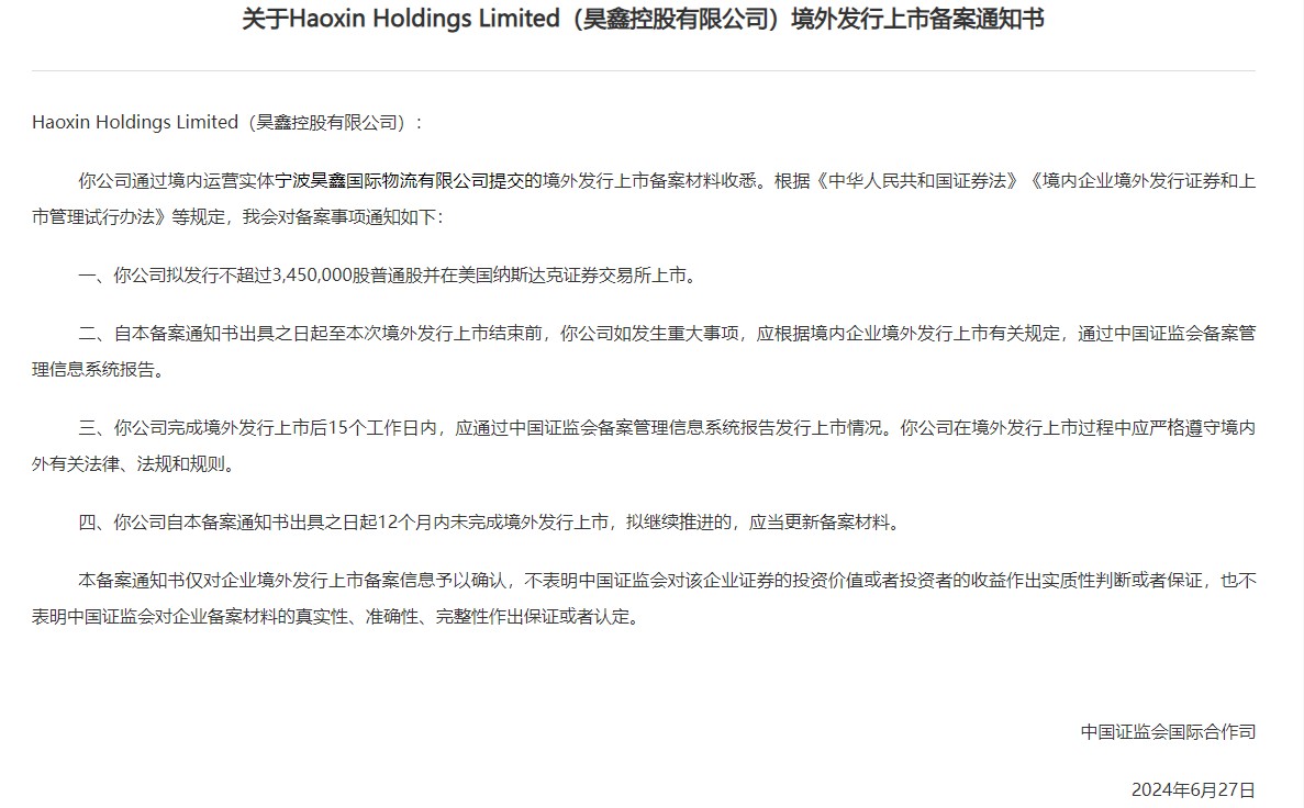 6月28日,中国证监会发布《关于Haoxin Holdings Limited(昊鑫控股有限公司)境外发行上市备案通知书》。昊鑫控股(HXHX.US)拟发行不超过3450000股普通股并在美国纳斯达克证券交易所上市。