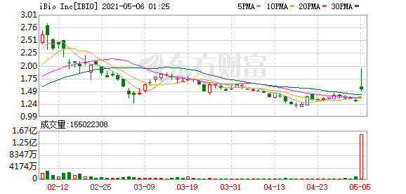 Ibio(IBIO.US)大涨44.95%报1.87美元,暂成交1亿美元,最新总市值4亿美元。