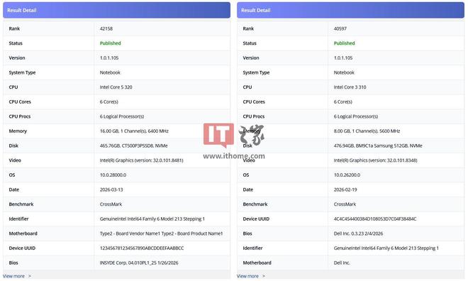 IT之家 3 月 24 日消息,BAPCo CrossMark 现已记录到了英特尔酷睿 5 320 / 酷睿 3 310 处理器的数据,此外酷睿 5 320 也出现在了 Geekbench 数据库中。