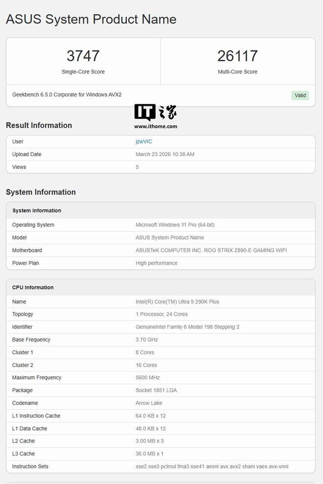 IT之家 3 月 24 日消息,科技媒体 Wccftech 昨日(3 月 23 日)发布博文,报道称英特尔未发布的旗舰处理器酷睿 Ultra 9 290K Plus 现身 Geekbench 跑分库,6.5.0 版本单核成绩为 3747 分,多核成绩为 26117 分。