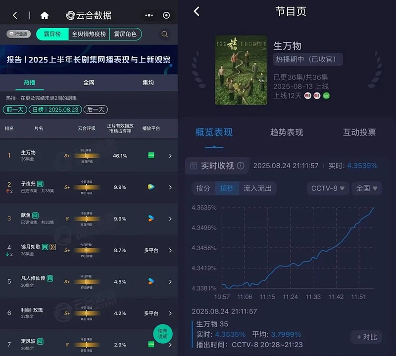 云合数据显示,《生万物》是2025年首部单日有效播放破亿的长剧,虽然8月中旬才上线,但正片有效播放已经超过13亿,排在暑期档累计有效播放榜单第三位,并以3681万的热播期集均有效播放位居暑期档榜首。同时,《生万物》也是正片有效播放市占率历史第三位,仅次于《狂飙》和《庆余年2》。