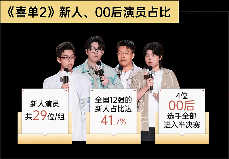 这种“被看见”的力量,首先体现在新人演员的崛起。今年《喜单2》共有27位新人登场,其中全国12强里新人比例高达41.7%,而4位00后选手更是全部闯入半决赛。