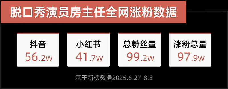 在更多被看见的“小人物”中,房主任无疑是其中最典型的代表。从6月27日到8月8日短短六周,她凭借《喜单2》的曝光成为赛道里涨粉速度最快的新人,抖音与小红书涨粉高达97.9万,总粉丝量逼近百万。