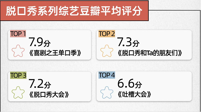 而在所有脱口秀节目中,《喜单》堪称标杆之作。我们汇总了过去几年季播类脱口秀综艺IP在豆瓣上的历年平均评分,其中,《喜剧之王单口季》《脱口秀和Ta的朋友们》《脱口秀大会》《吐槽大会》都表现不错,得分均在6.5分以上,《喜单》则以7.9的平均分成绩领先于同类型节目。(注:平均分基于两季节目的综合表现,分数取自两季数据的平均值。)