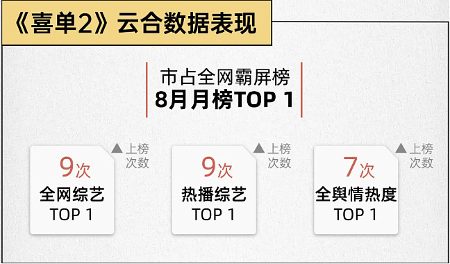 《喜单2》整季节目仅有10期,据云合数据显示,《喜单2》不仅在“市占全网霸屏榜8月月榜”中荣获TOP1,还在细分维度中多次登顶:获得“全网综艺TOP1”共9次、“热播综艺TOP1”9次、“全舆情热度TOP1”7次,成为云合唯一夺得TOP1、且多次霸榜TOP1的喜剧综艺。