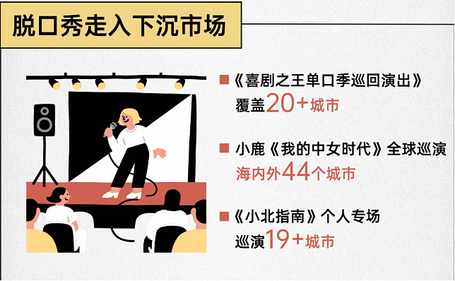 例如,《喜剧之王单口季巡回演出》走过20多座城市,拼盘演出大麦评分高达9.2,小鹿等知名演员也在节目后随即启动全国巡演,这些动作不仅拓宽了市场的广度,也提升了脱口秀文化传播的深度。