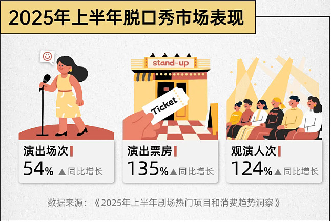数据显示,2025年上半年,脱口秀已成为剧场演出第二大品类,占总票房的16%。更惊人的是增长率——演出场次同比上升54%,票房激增135%,观演人次增长124%。