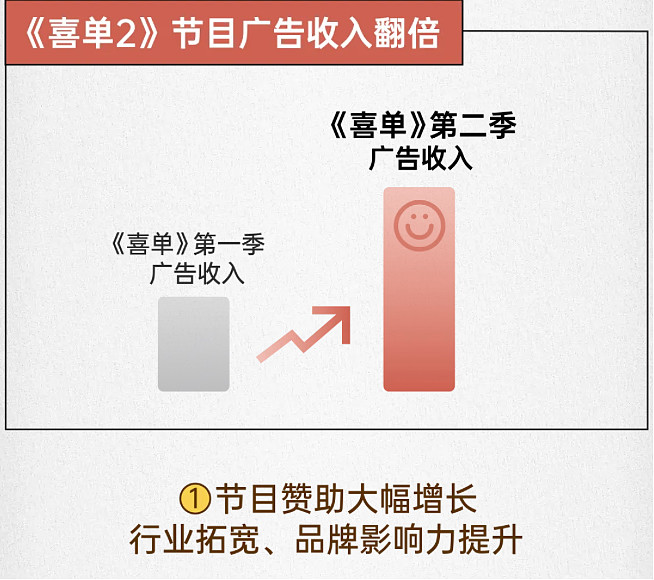 随着线上线下的出圈效应叠加,广告主们也看见了喜剧内容背后蕴藏的巨大潜力。爱奇艺数据显示,《喜单2》广告收入较首季实现翻倍。