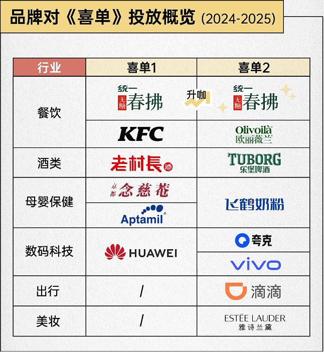 可以说,《喜单2》不仅让合作数量大幅增长,更通过行业版图的拓宽与营销玩法的升级,让品牌影响力在节目舞台和大众市场上实现了双重放大。