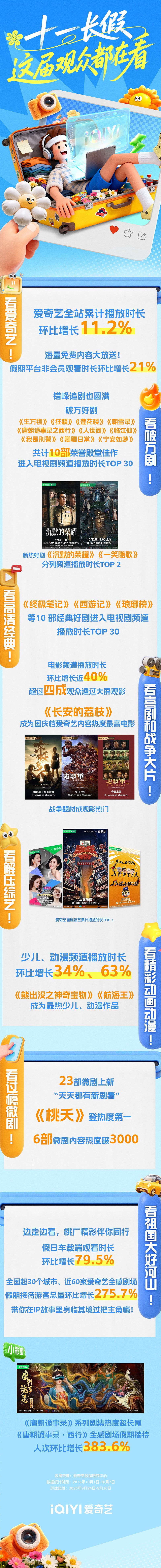 新华社数据显示,十一假期前半程自驾出行人次超2.4亿,越来越多“在路上”的观影需求涌现。国庆假期前7天,爱奇艺车载端观看时长环比增长79.5%。