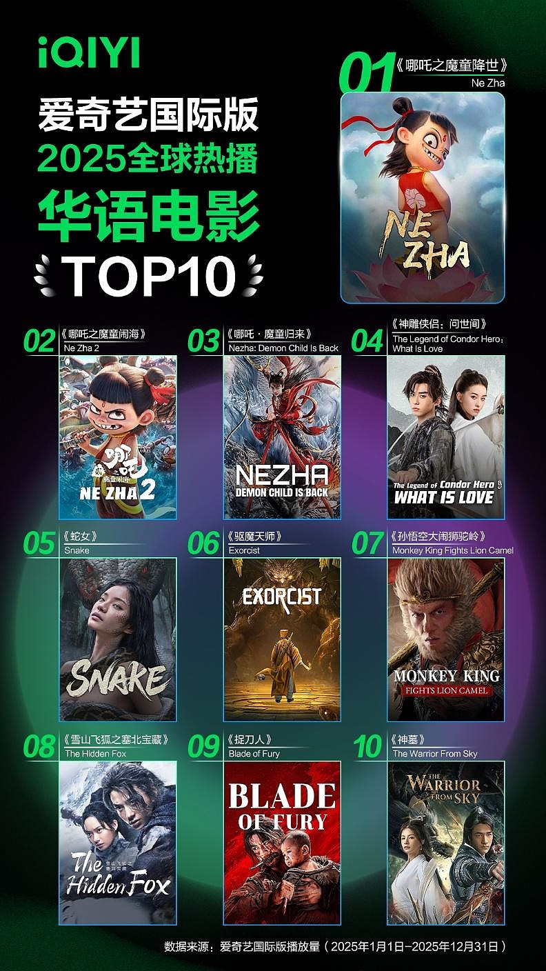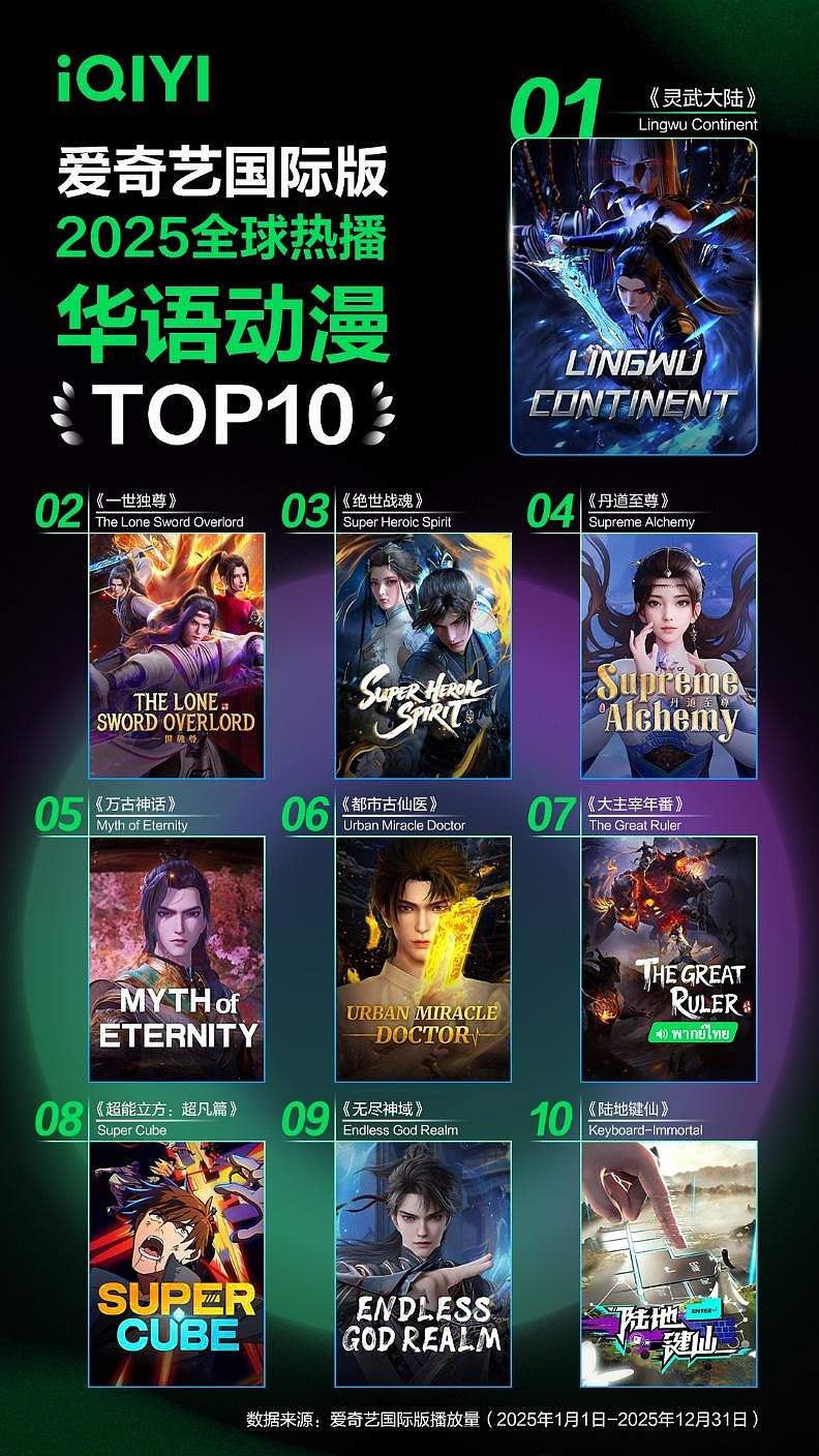 2026年1月20日,《爱奇艺国际版2025全球内容热播榜》正式发布,华语多样化内容正以前所未有的关注度和流行度席卷全球市场。2025年爱奇艺国际版内容播放量持续强劲增长,同比增长114.5%,华语内容成为驱动这一增长的核心动力。年度榜单显示,融合“中医文化”元素的华语都市爱情剧《爱你》登华语剧集榜首;《灵武大陆》《哪吒之魔童降世》等热血动漫和电影也深受海外用户喜爱;东南亚、北美、东亚、中东北非等地区则呈现出鲜明的观看偏好差异。