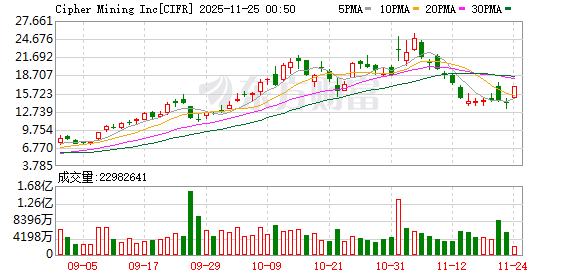 美股加密矿企涨幅持续扩大,Cipher Mining大涨17%,IREN、CleanSpark涨超12%,Applied Digital涨超11%。