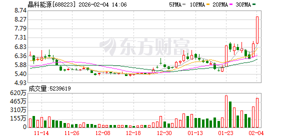午后开盘,晶科能源直线拉升,短短几分钟内20%涨停,每股报8.40元,最新市值840亿元,今年以来,晶科能源累计涨幅已近49%。消息面上,市场有传闻称,马斯克团队近期秘密走访了中国多家光伏企业,考察项目涉及设备、硅片、电池组件等环节,其中重点考察了有异质结、钙钛矿技术路线的光伏企业。晶科能源回应,近期确实与马斯克团队相关考察团有过接触。