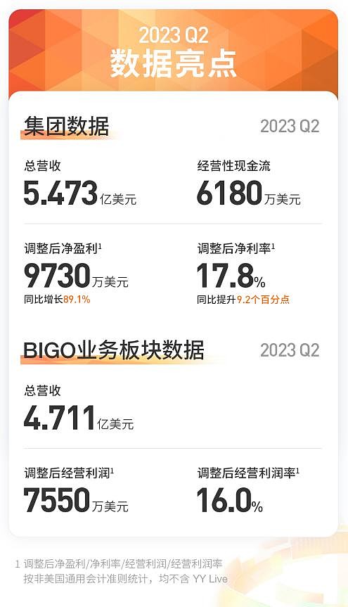 北京时间2023年8月30日,欢聚集团(NASDAQ:YY,简称“欢聚”/“集团”)发布2023年第二季度财报。第二季度,欢聚集团收入5.473亿美元,核心业务BIGO板块收入达4.711亿美元。在非美国通用会计准则下,集团净盈利同比增长89.1%至9730万美元,净利率达17.8%;BIGO板块经营利润7550万美元,经营利润率16.0%。集团录得正向运营净现金流,达6180万美元。