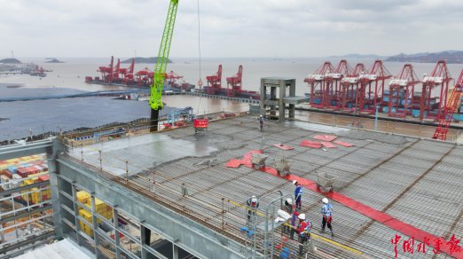 宁波舟山港北仑港区灰库项目一期工程的砌体工程施工现场,工人们正紧锣密鼓地进行空箱库钢结构墙面檩条安装、工艺设备调试、机电工程安装等关键作业。目前,项目工程正按计划稳步推进,预计今年6月竣工。