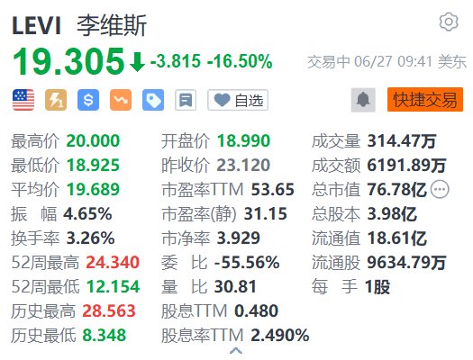 格隆汇6月27日|李维斯(LEVI.US)跌16.5%,报19.3美元。消息面上,李维斯第二季度净营收14.4亿美元,分析师预期14.5亿美元;调整后EBIT为0.87亿美元,分析师预期0.659亿美元。该公司维持全年净营收增速预期在1%-3%。李维斯财务主管Harmit Singh将销售额下滑归咎于不利的外汇条件和Docker’s的销售疲软。