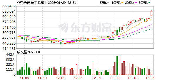 洛克希德马丁股价涨7.6%创历史新高,此前公司预测2026年利润和收入将高于预期。