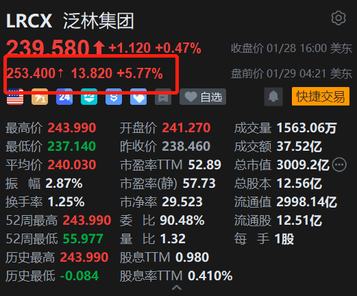 半导体制造设备商泛林集团(LRCX.US)盘前涨约6%,报253.4美元,开盘势创历史新高。消息上,泛林集团公布了超预期的2026财年第二季度财报和业绩指引。财报显示,该公司二季度营收达53.4亿美元,同比增长22%,超出预期1亿美元;非公认会计准则下每股收益为1.27美元,超出预期0.10美元。展望未来,泛林集团预计第三季度营收将在54亿美元至60亿美元之间,远超此前53亿美元的预期。预计每股收益将在1.25美元至1.45美元之间,高于市场普遍预期的1.20美元。