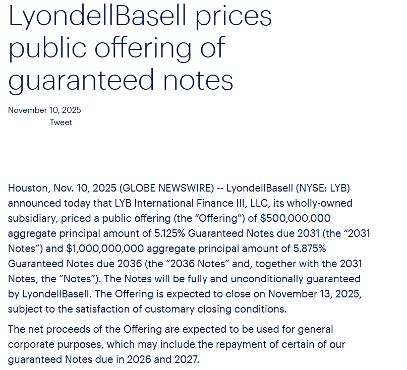其中包括总计5亿美元,票面利率5.125%,2031年到期的担保票据,和总计10亿美元,票面利率5.875% ,2036年到期的担保票据(“2036年票据”,与2031年票据合称为“票据”)。以上票据将由利安德巴塞尔提供完全且无条件担保。本次发行预计将于2025年11月13日交割。