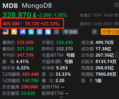 AI应用股MongoDB盘前大涨超23%,报405.59美元。消息上,MongoDB 2026财年Q3营收6.28亿美元超预期,同比增长19%;超出了公司指引的上限,这得益于Atlas业务的持续强劲增长,其同比增速提升至30%。基于这一强劲势头,公司上调了本年度剩余时间的营收和利润指引。