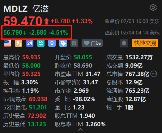 奥利奥制造商、美国食品巨擘亿滋(MDLZ.US)盘前跌4.5%。消息上,亿滋公布了稳健的第四季度业绩,调整后每股收益(EPS)为0.72(同比增长11%),高于市场预期的 0.70;收入达105亿(同比增长9%),超出预期2.07亿。管理层预计2026年的有机销售增长将持平至+2%,调整后的每股收益增长(以固定汇率计算)将持平至+5%,均低于长期目标的3%-5%和高个位数增长。