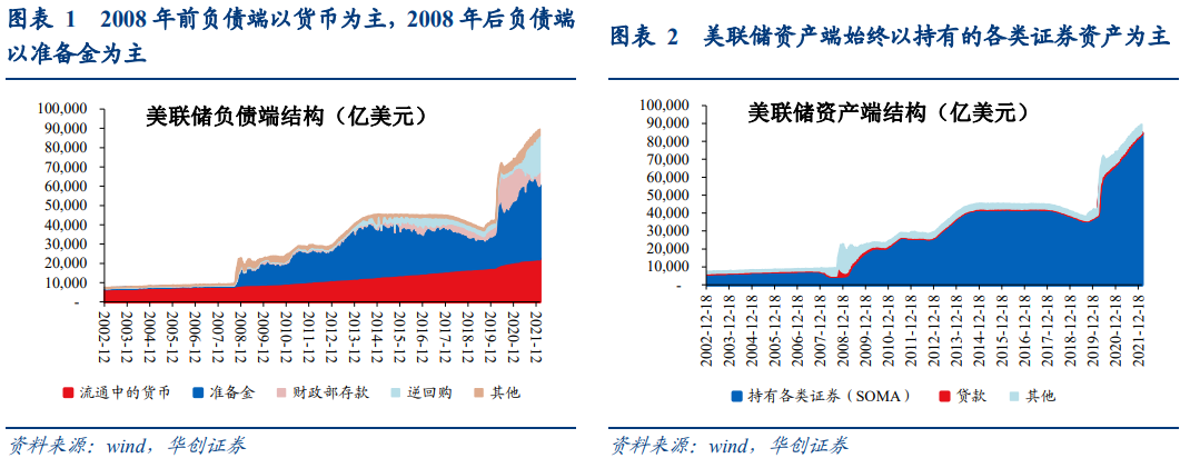 美联储的资产负债结构会自然带来利息收入,历史上美联储每年均可获得稳定收入,并几乎全部汇入美国财政部。美联储资产端以系统公开市场账户(SOMA)所持有的各类有息证券(如国债、MBS等)为主;负债端在2008年金融危机前以流通中的货币为主,美联储无需对此付息,在2008年金融危机后以准备金+流通中的货币为主,随着2015年加息启动,美联储需要为准备金支付利息。